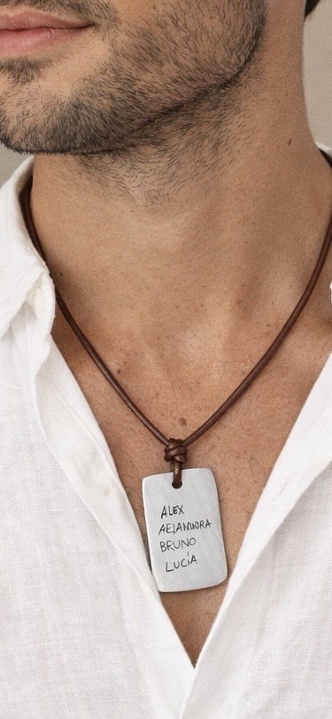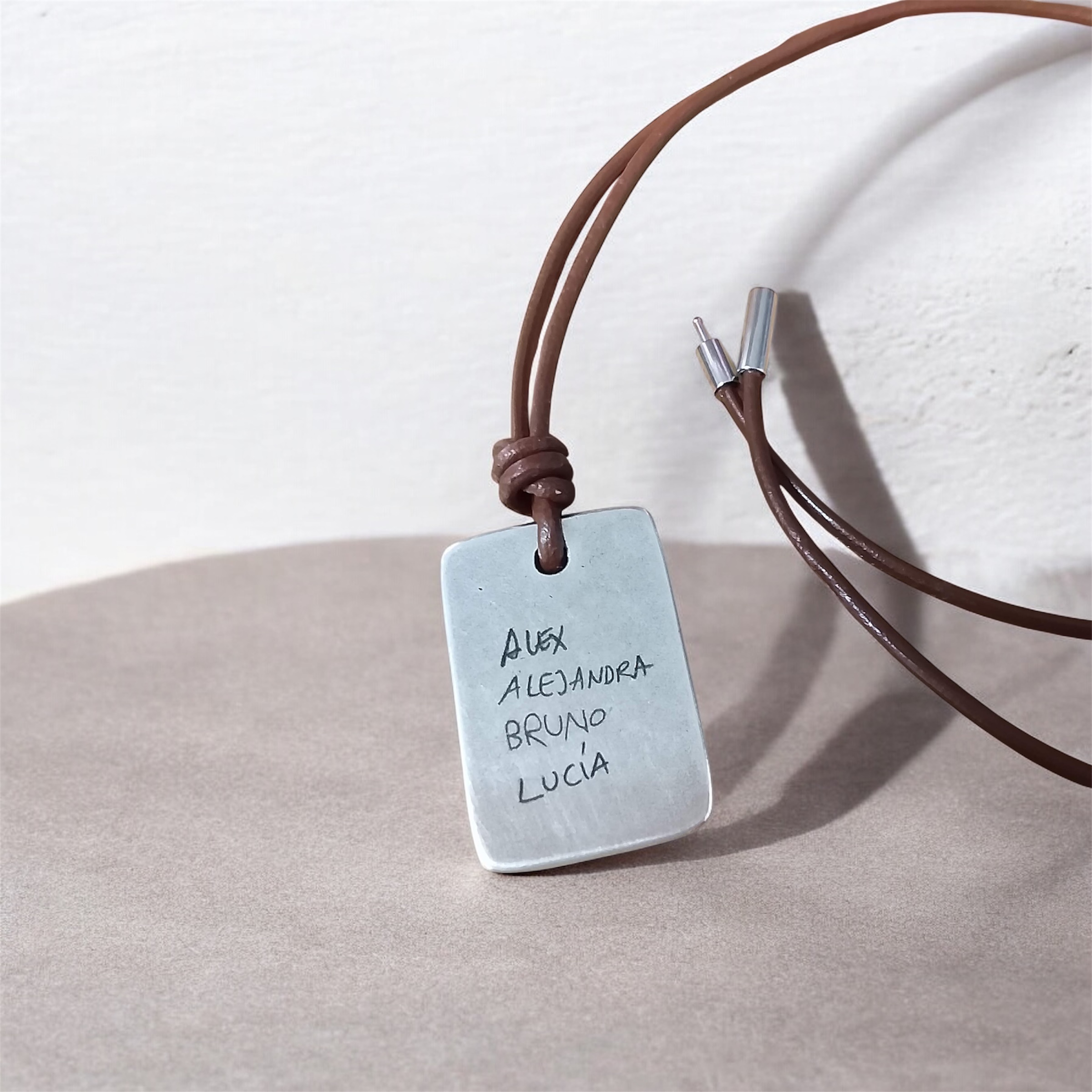 Colgante en cuero negro o marrón a elegir, con los nombres de tu familia o de quien tú quieras, manuscritos y grabados láser. Material zamak con baño de plata de ley.